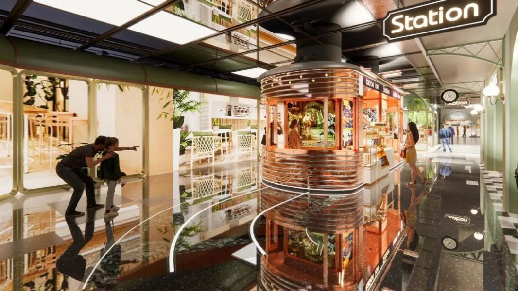曹路曾是海盐传输的重地,也曾是上世纪二三十年代上川铁路上南来西去的枢纽站。曹路招商花园城地下一层2300平方米的“曹路市集”,充分挖掘在地文化的精髓,再现运盐河场景和旧时的生活气息,以天空之境、浮岛秘境、星海奇航为名,分别对应历史中的盐田区、码头区和运河区,沉浸式融入矿车、铁道、车站、渔网、灯塔等元素,传递船只交错、市井繁荣的空间感和故事性。