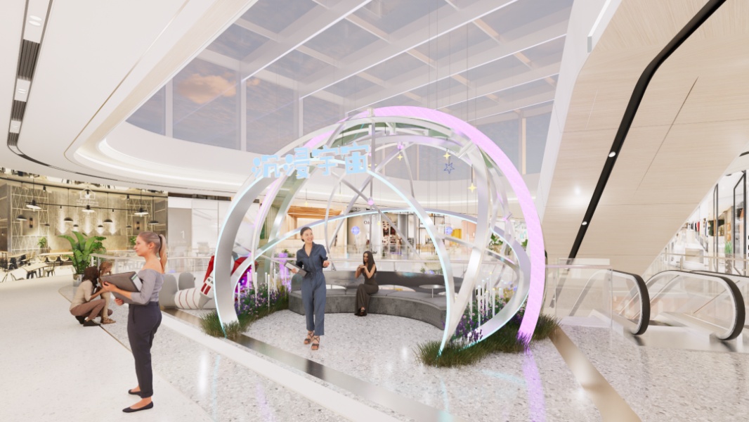 购物中心从主入口到场内中庭,从地下通道到屋顶空间,不同场景都将星空和星际要素一一着墨。屋顶有星际跑道,室内有星河特色卫生间、星船休憩室,中庭和通道利用美陈装置营造出漫天繁星和星系穿越的壮阔氛围。