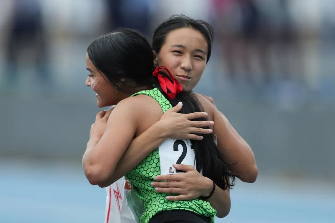 中国选手陈妤颉(右)在决赛后接受祝贺此外在本届U15世界中学生夏季运动会上中国队选手严子怡获得女子铅球冠军拿下本届赛会的首枚金牌