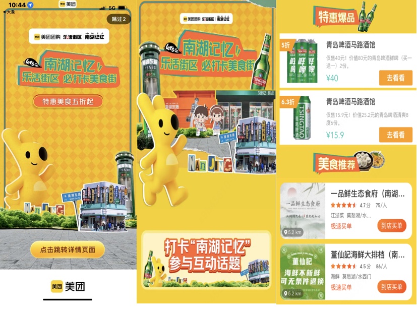 8月24日,在南京市商务局,建邺区政府指导下,建邺区商务局、建邺区城建集团、莫愁湖街道主办,美团承办的南湖记忆乐活街区暨大众点评必打卡美食街开街仪式顺利启动,南湖记忆街区通过美团“乐活街区”与“大众点评必系列 IP”焕新升级,与街区内近50家商户进行特惠活动联动,并联合青岛啤酒(华东)销售有限公司,提供近十万瓶特价低折优质啤酒在乐活街区进行专属特价促销,通过多种流量资源位引流,推进线上+线下具有烟火气的街区建设,塑造街区消费名片,为拉动居民消费商户经营提质增效,推进服务零售消费提质扩容。