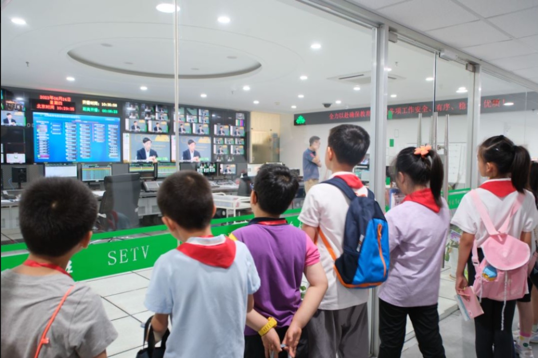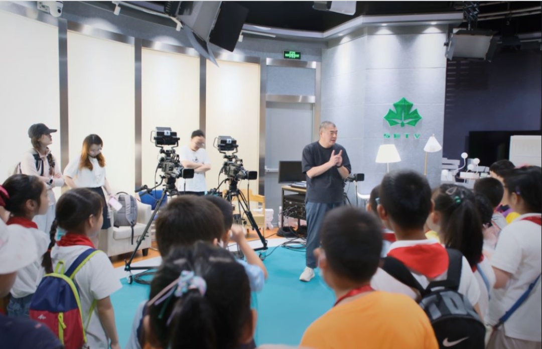 在上海教育电视台,小记者们在工作人员的带领下,参观了演播厅、制作室和机房,了解节目制作全流程,并在“开学第一课”录制的演播室模拟了播报环节。