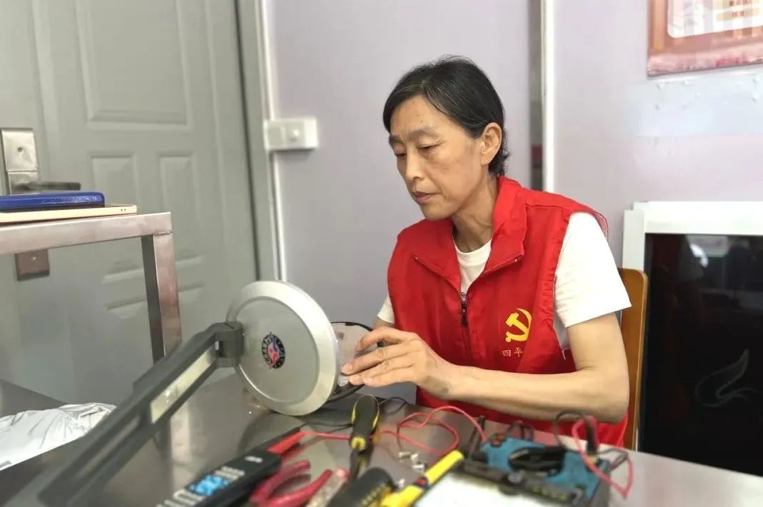 67岁的周忠民,年轻时是上海手表厂的学徒,了解国内外各种钟表的品牌和构造。退休后,作为四平路街道志愿服务队的一员,头戴专用放大镜,是他独特的“出场造型”。而王继东则是“电器维修界”少见的“女将”,一袭志愿红马甲,她同样穿了二十几年。他们的坚守,是因为居民的需求一直存在。“反正退休了,闲着也没事,需要我,我就多来服务服务。”王继东说。