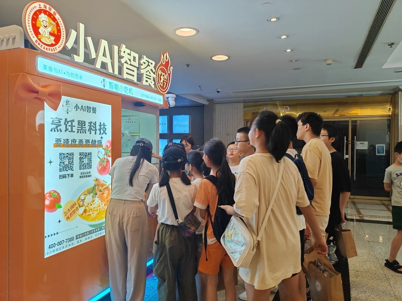 随后,社区青少年一同走进街道的“虹翼空间”实践服务基地——位于世贸商城的小Q饭堂,近距离参观小AI智餐、小AI智面局、小Q饭堂无人后厨,感受科技重塑下智慧餐饮的魅力。