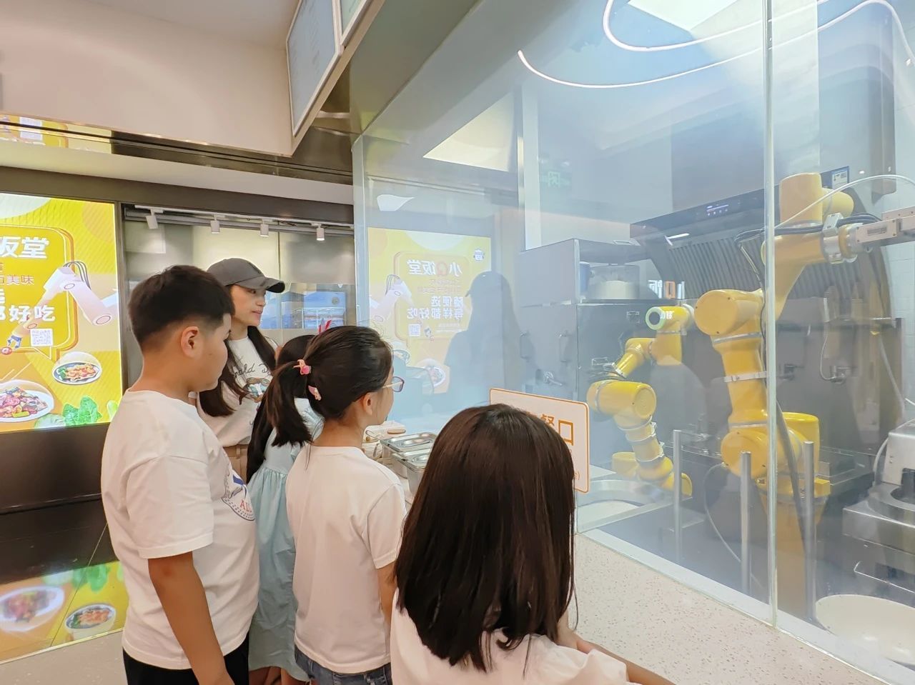 在小AI智面局,小朋友在工作人员的指导下,在机器的自助机上选定自己喜欢的菜品下单, 两个机械臂便开始“分工协作”:一个负责取面、下面,待面条煮好后,另一个则负责取碗,将盛着面条的碗放入既定轨道,推送至出汤口加汤,机械臂配合默契,整个流程一气呵成。