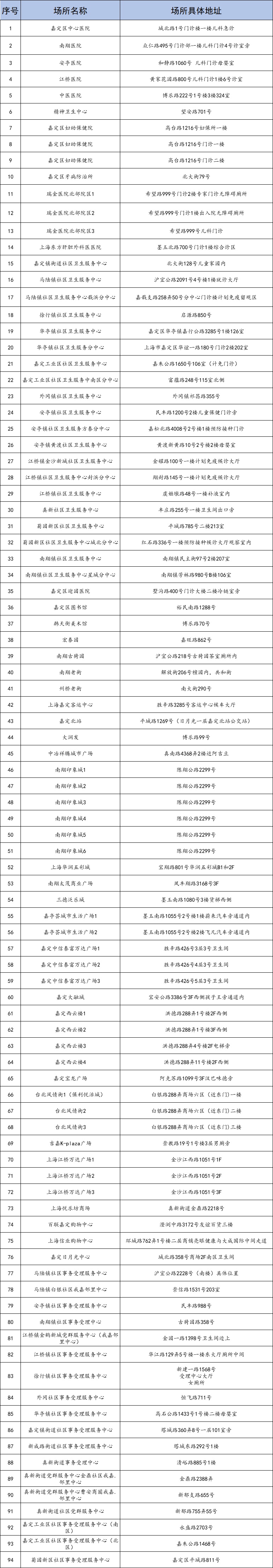 上海市嘉定区公共场所母婴设施点位信息表