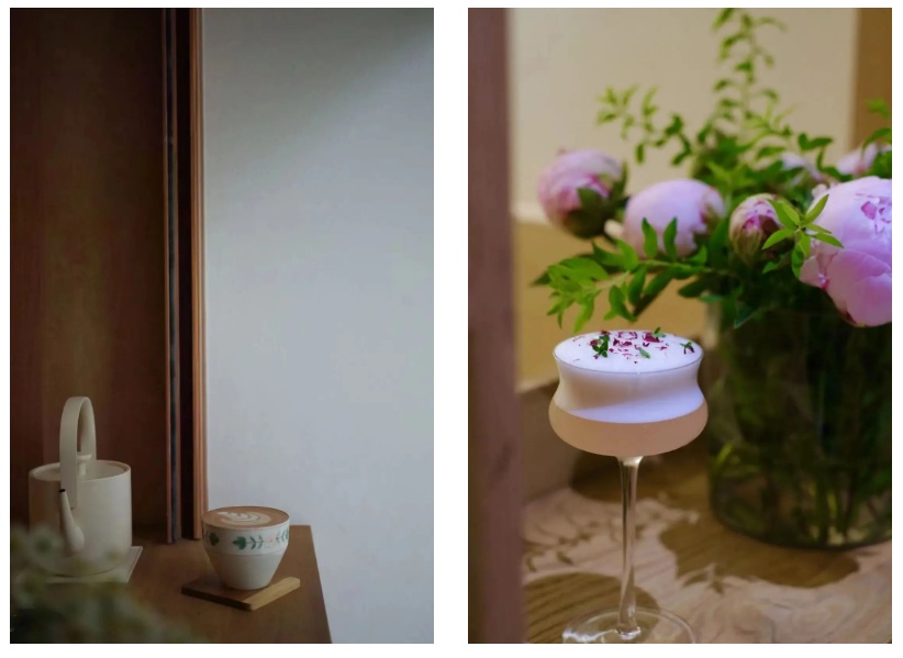 桂花普洱与拿铁交织的鸳鸯、古树滇红点缀着拿铁的红颜,腹有诗书气的茶咖名称,听上去就让人跃跃欲试;茶酒也同样如此,贵妃醉由玫瑰花茶、伏特加、贵妃荔枝和青柠调制而成,酸梅汤里浓缩着桂花、岩茶、威士忌、桂花普洱和山楂汁,另类的组合让茶饮充满了想象。