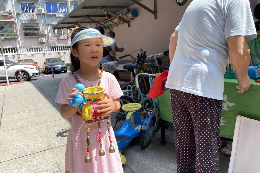 另一边,“花卷”小朋友和妈妈带着自己的扭扭车来到现场,准备交换市集上的一个小背篓,花花绿绿的非常好看。