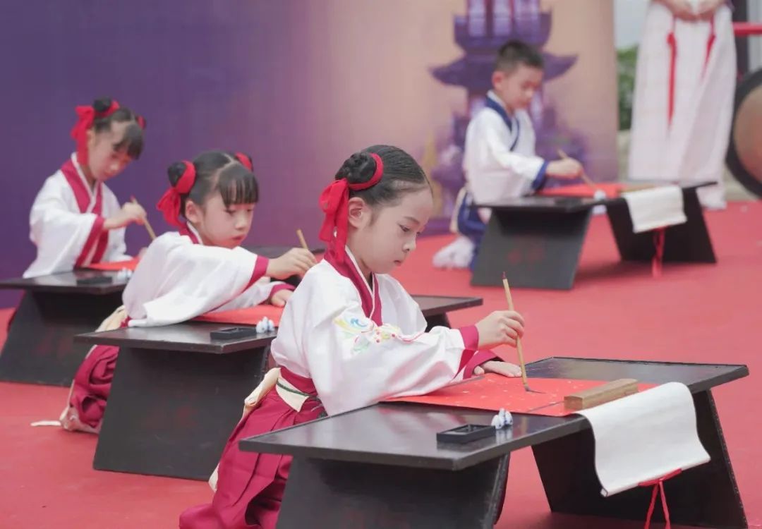 法华塔在嘉定素有“文笔峰”的美誉。伴随着悠扬的琴鼓声起,“开笔礼”在古朴庄严的法华塔下拉开帷幕。学生们身着汉服,手握毛笔,一撇、一捺,郑重写下“人”字。击鼓鸣志后,学生的额头上被点上朱砂“启智”。