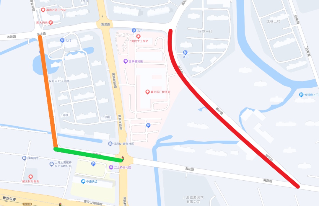 海蓝路(嘉峪关路-黄家花园路)全长139.75米,海蓝路(卧龙路-嘉闵高架)全长189.85米。道路红线宽度20米,规划为城市支路,设计车速为30公里/小时,车行道宽12米,单向人行道宽4米。 嘉峪关路(海蓝路-海波路)道路全长307.51米,红线宽度为16米。道路等级为城市支路,包括人行道和机非混合车道,设计车速30公里/小时。 榆中路(海蓝路-海波路)道路全长500米,红线宽度24米,车行道宽15米,单向人行道宽3米。道路等级为城市支路,设计车速为30公里/小时。沿线新建跨径30米的桥梁1座,同步实施道路绿化、标志标线、路灯照明及公用管线等附属工程。 据悉,此次通车的4条道路均位于江桥镇北部社区,周边有天禧嘉苑、嘉海雅苑、保利云上等多个居住小区。道路启用后,可进一步完善江桥北部社区道路基本骨架路网,有效缓解周边小区交通压力。“以前走黄家花园路,车流量大,一个红绿灯要等好久,现在从嘉峪关路转海蓝路,可以避开这一段,方便不少。”家住附近的张女士表示。 另据了解,海蓝路是江桥镇一条东西向道路,其西端与嘉闵高架相连,向东至中槎浦,全长约4.3公里。目前仅剩嘉峪关路至卧龙路段尚未建成通车,待全线打通后,附近小区居民出行将更便捷。
