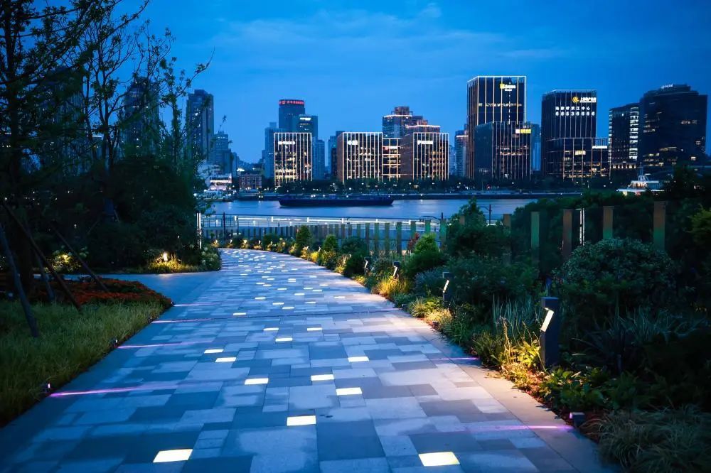 当夜幕降临,花桥栏杆上安装了近百块光电玻璃,夜晚可以呈现精美的动画效果,与周围的花草交相辉映,成为外滩的又一道亮丽风景线。