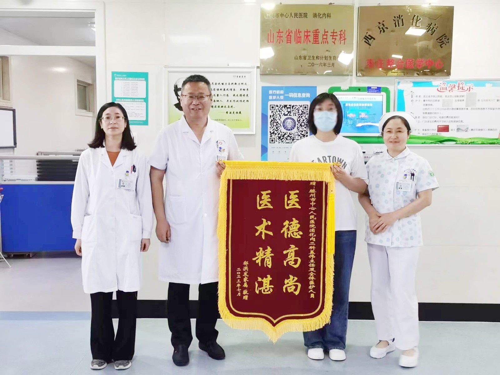 近日,患者家属将一面写有“医德高尚 医术精湛”的锦旗送至滕州市中心人民医院消化内科二病区,以感谢全体医护人员的精心救治。