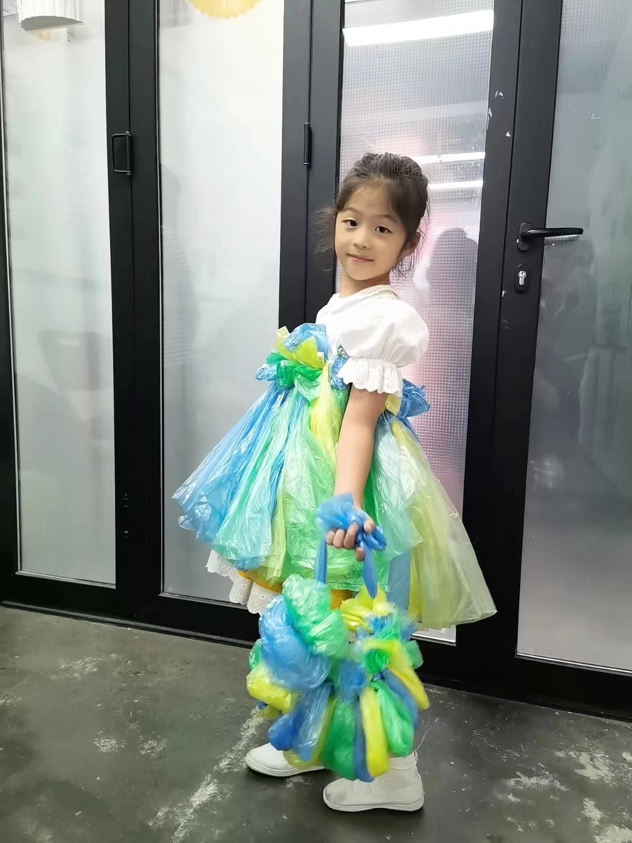 伴随着动感音乐,一场富有创意、别具一格的“环保时装走秀”闪亮登场。彩色吊带裙、蓝色梦幻公主裙、奥特曼卡牌背心……将环保理念很好地融进了服装设计中,创意十足。小模特们身着“奇装异服”大方自信地走在展示台上,自信满满、笑脸盈盈,展示的不仅仅是一场环保时装秀,更是向大家传递一种绿色、健康、环保的生活理念。