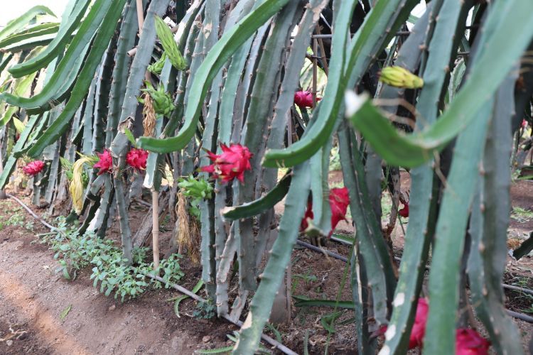 大棚内的火龙果枝条缠绕在架子上,工人们正在开展剪枝、除草、施肥等管护作业,为提升果品果质和丰产丰收打下基础。据农场负责人介绍,农场利用钢架大棚栽种的火龙果有红玫瑰、水晶、红绣球等多个品种,平均亩产量2000公斤以上,从目前火龙果长势来看,由于品种不同,采摘可延续到12月底。除了带来经济效益外,种植基地还成了一处旅游景点。每到节假日,不少市民和游客都会来到这里体验采摘乐趣,品尝田园风味,形成了种植+采摘+旅游的发展模式,促进了农旅融合。