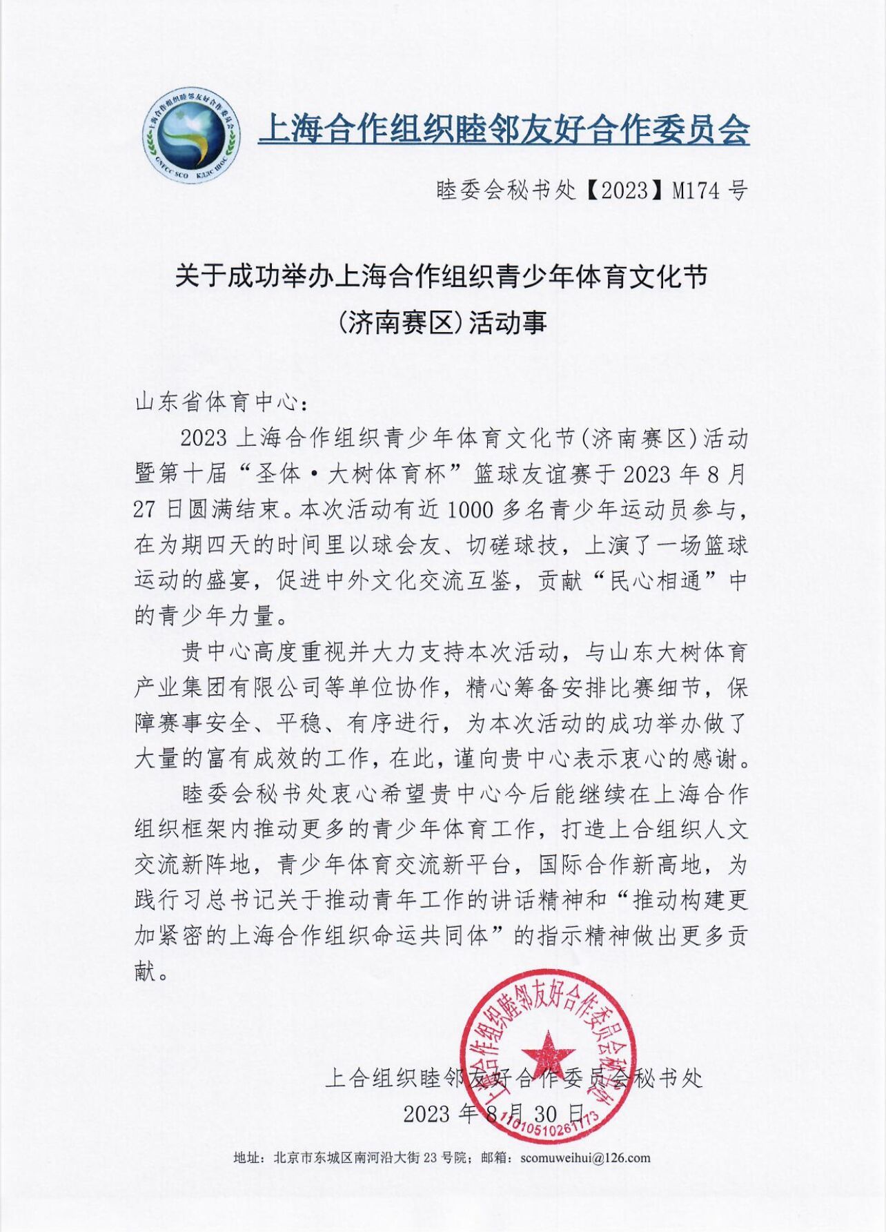 8月30日,上海合作组织睦邻友好合作委员会向省体育中心发来感谢信,对省体育中心在上海合作组织青少年体育文化节(济南赛区)活动中给予的大力支持和优质服务表示感谢。