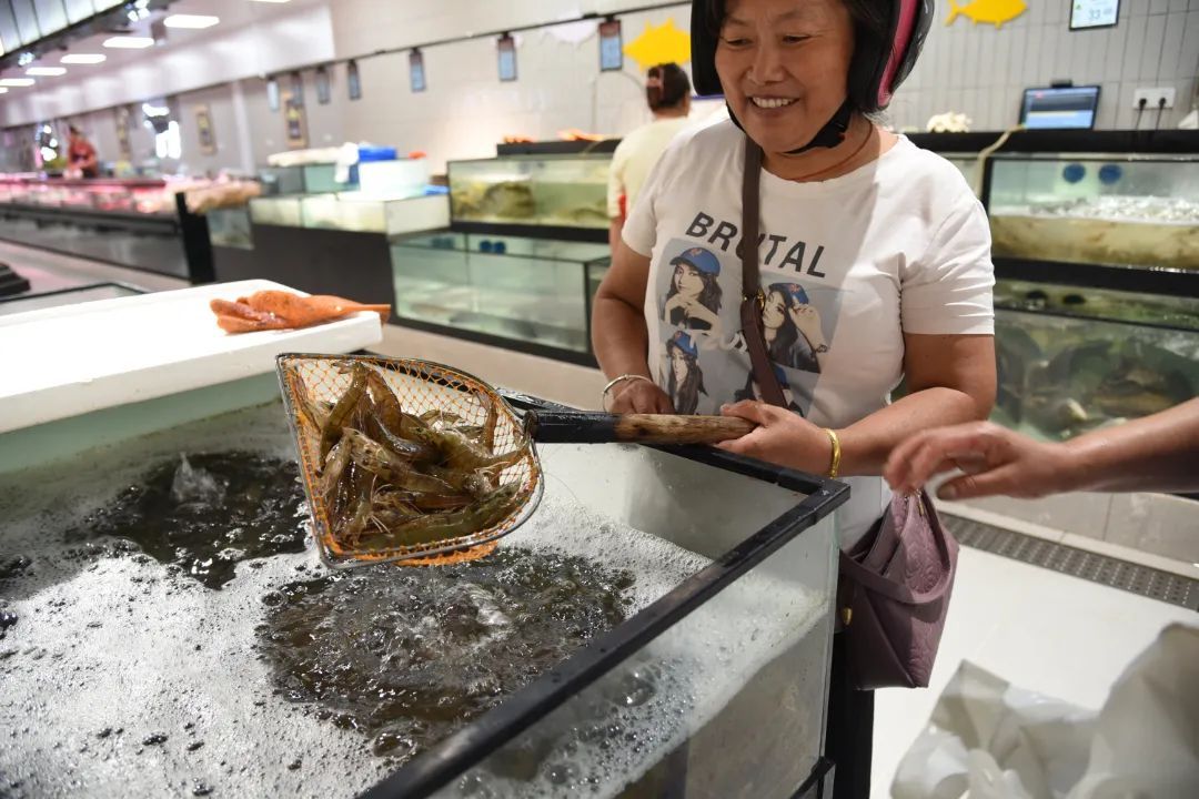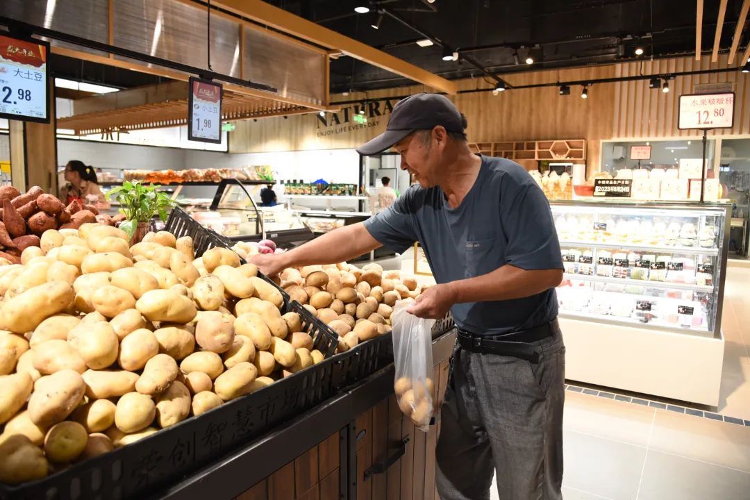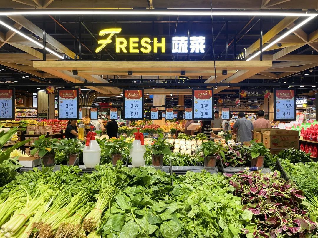 小嘉在现场看到,与传统的农贸市场格局不同,荣创智慧市场采用超市化设计,各种商品在货架上有序摆放。“这里有新鲜的蔬菜水果、品种丰富的肉类水产,还有各式各样的生活用品,基本上可以满足周边居民的一站式购物需求。”荣创智慧市场总经理蓝长城介绍。