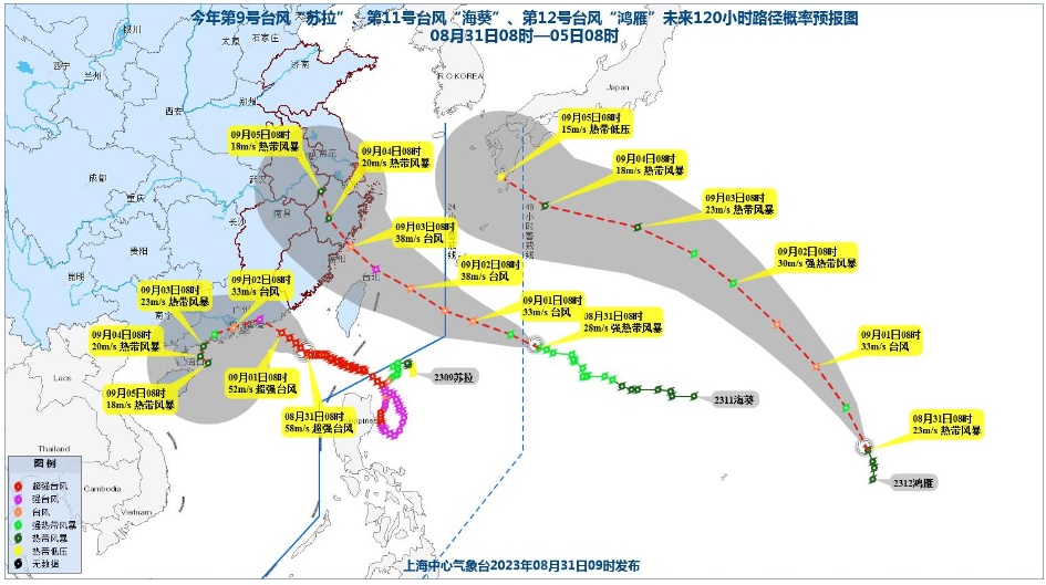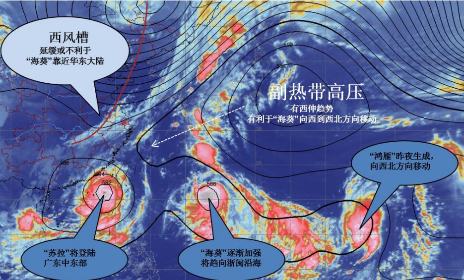 预计,“海葵”将以每小时15~20公里的速度向西偏北方向移动,强度逐渐增强,最大强度可达台风级或强台风级(38~42米/秒,13~14级),9月1日夜间到2日上午进入我国东海海域,并逐渐向浙江南部到福建北部沿海靠近,需关注其对我国华东沿海产生的影响。