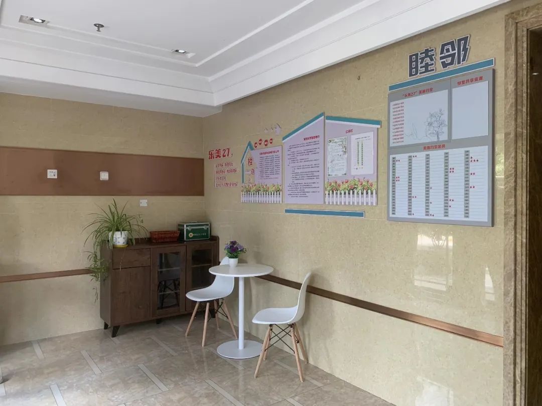 小区27号单元楼是公租房(两梯5户,21层,总共105户),也是入住率最高的一栋楼,龙潭社区党支部通过与奉贤公租房公司党支部签订党建联建协议,共同打造“乐美27”楼。以“共享客厅”形式打造的党群微家,兼具了党群阵地的政治功能和服务功能,组织党员开展党史学习的同时这里也成了居民“自治微阵地”,楼道说事、志愿服务、消防安全宣讲、法律服务咨询等一系列为民服务功能都能在这里实现,营造了浓厚的共治氛围。
