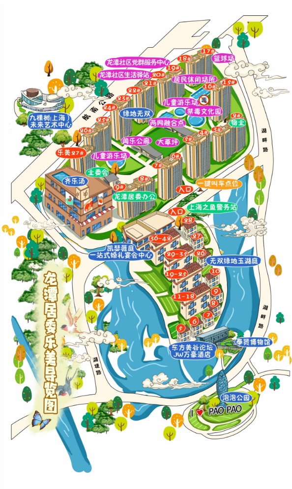 为了让居民能够更直观地解读社区,提升居民的家园意识,破解“居民认同、精准服务、资源共益”等社区发展治理难题,龙潭社区精心打造《金海街道龙潭社区乐美导览图》,通过漂亮美观的手绘地图、通俗易懂的文字,将社区内的共享资源在地图上进行统一标注,让居民可以快速找到自己想去的场所。