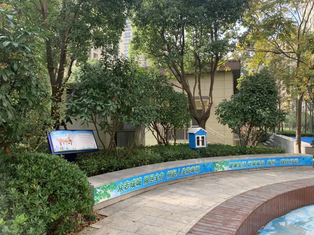 龙潭社区禁毒文化园坐落于小区东南角,面积约800平方米,通过规划整合功能分区,设置禁毒宣传教育设施,打造禁毒宣传阵地。园内共有各类禁毒宣传栏8块,内容包含毒品常识、危害、防范和标语等内容,通过普及毒品知识,提升群众防范毒品的能力和意识。此外,龙潭社区禁毒教育园地将禁毒文化元素及宣传内容与公共休闲娱乐有机融合,让居民在享受文化景观的同时接受禁毒教育和熏陶,提升居民识毒、防毒、拒毒的意识和能力,从而营造全民抵制毒品、共同参与禁毒的良好社会氛围。
