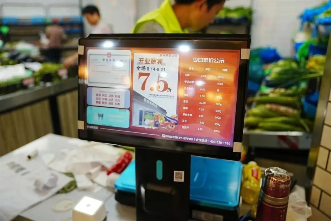 改造后的嘉保集贸市场更加“智慧”,每个摊位均配备了AI智能电子秤,可自动识别菜品。店家称重后,即可把小票打印出来给到顾客,上面清楚地记载着重量和价格,该交易信息也会同步到入口处的智慧大屏上。