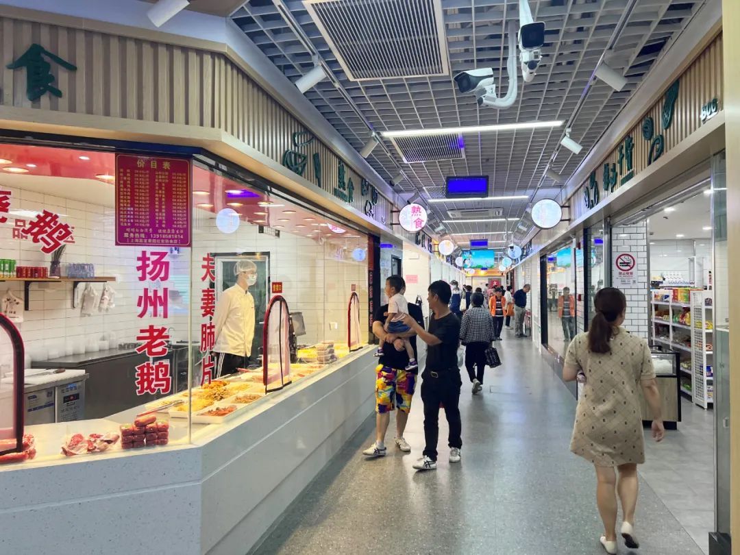 嘉保集贸市场原址位于保利五月花美食广场二楼,上下楼梯给老年人造成不便。改造后,市场移位于一楼,并设置了3个出入口,主入口设立智慧大屏,用于展示市场信息、交易数据、公示农残检测结果等,让市民更直观地了解市场摊位的销售数据以及货品的新鲜度。