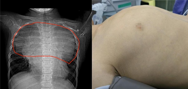 左图:红色圈出范围为胸腔内肿瘤占据的空间;右图:乐乐的胸廓明显凸起