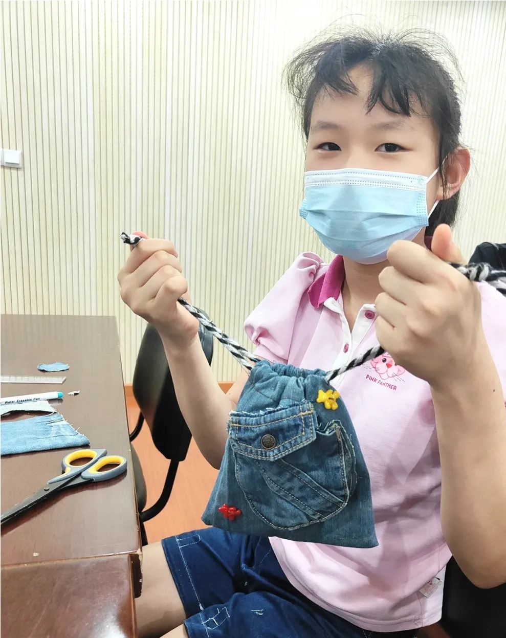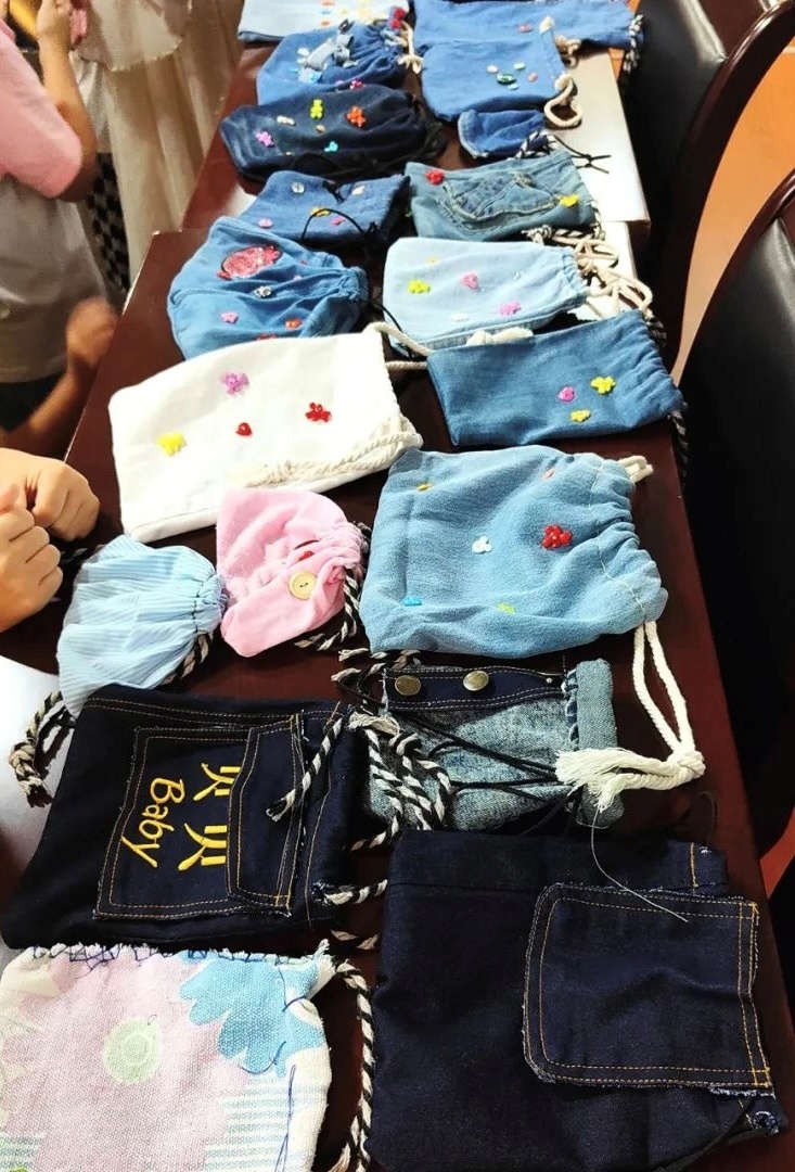 经过悉心的制作与装饰美化,一个个创意十足、可爱实用的牛仔束口袋诞生了!孩子们拿着自己和家长共同制作的作品爱不释手。家长们纷纷表示,孩子平时在家从来没拿过针线,通过旧物改造活动得到了这方面的锻炼,觉得十分有成就感。
