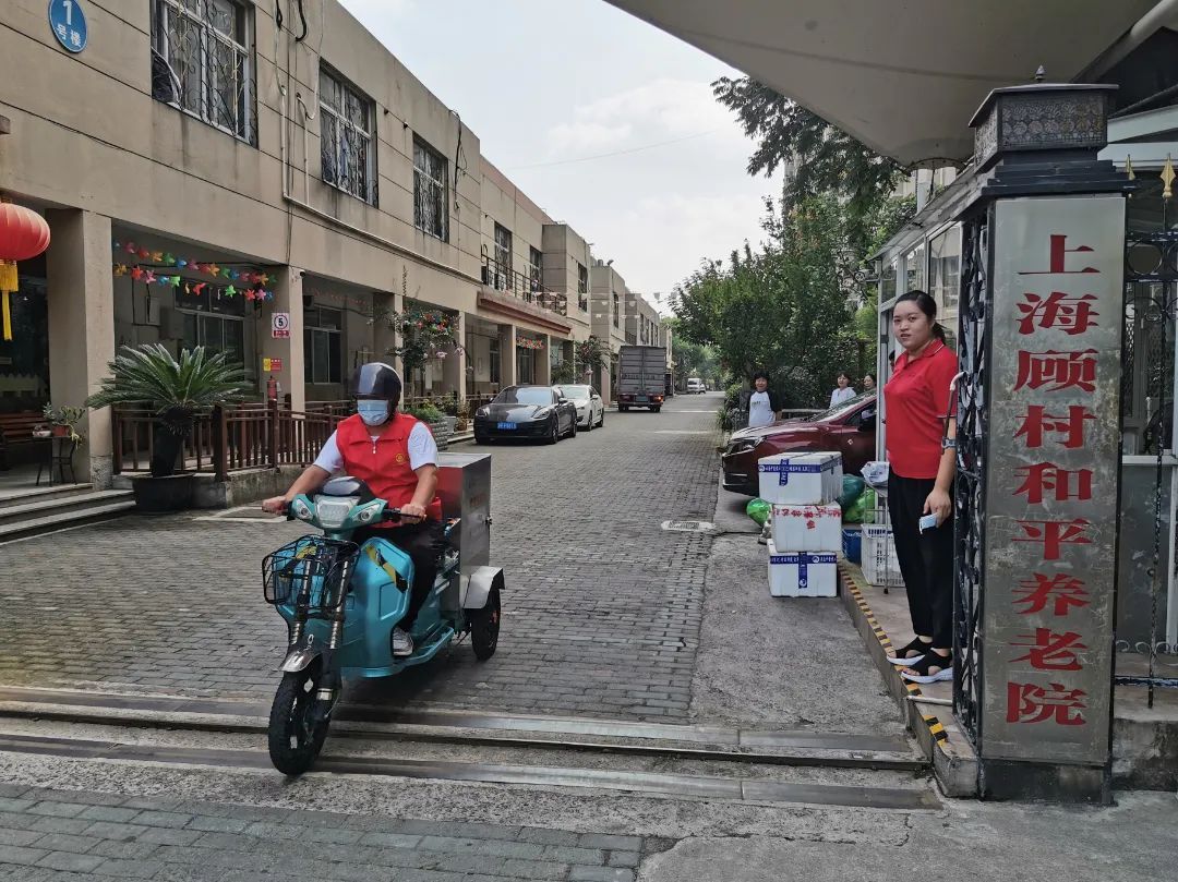 上午9点多,食堂的师傅们已做好热气腾腾的饭菜,开始为居民区的服务对象配餐。午餐包括红烧小排骨、虾仁炒青豆、杭白菜、大米饭,负责上门送餐的袁师傅将40多份饭菜装上三轮电瓶车,分别前往“海尚菊苑”等邻近小区为老人们送餐到家。对于袁师傅来说,这些老人已经是自己的老熟人了,看见他们就像看到自己的长辈亲人一样。顾村镇和平养老院送餐员工袁先生表示:“自己每天要送40多份饭菜,一直送到11:40左右,都是扶老助餐。”