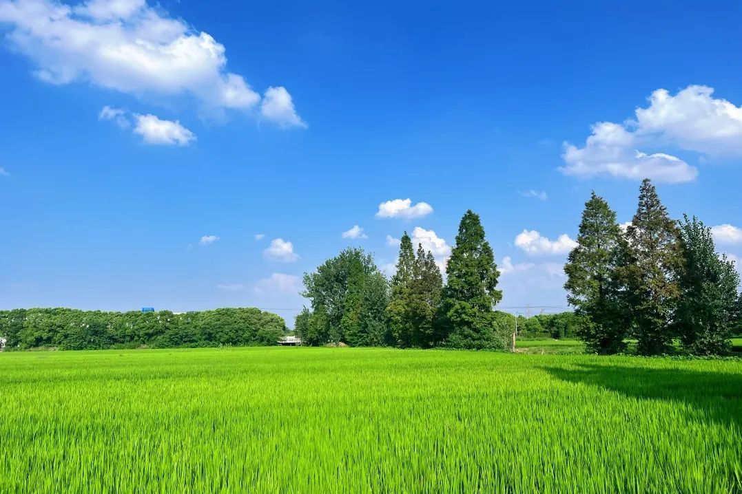 田野一片碧绿,满目葱茏,迎接着生机勃勃的风,稻田里的禾苗在茁壮生长。