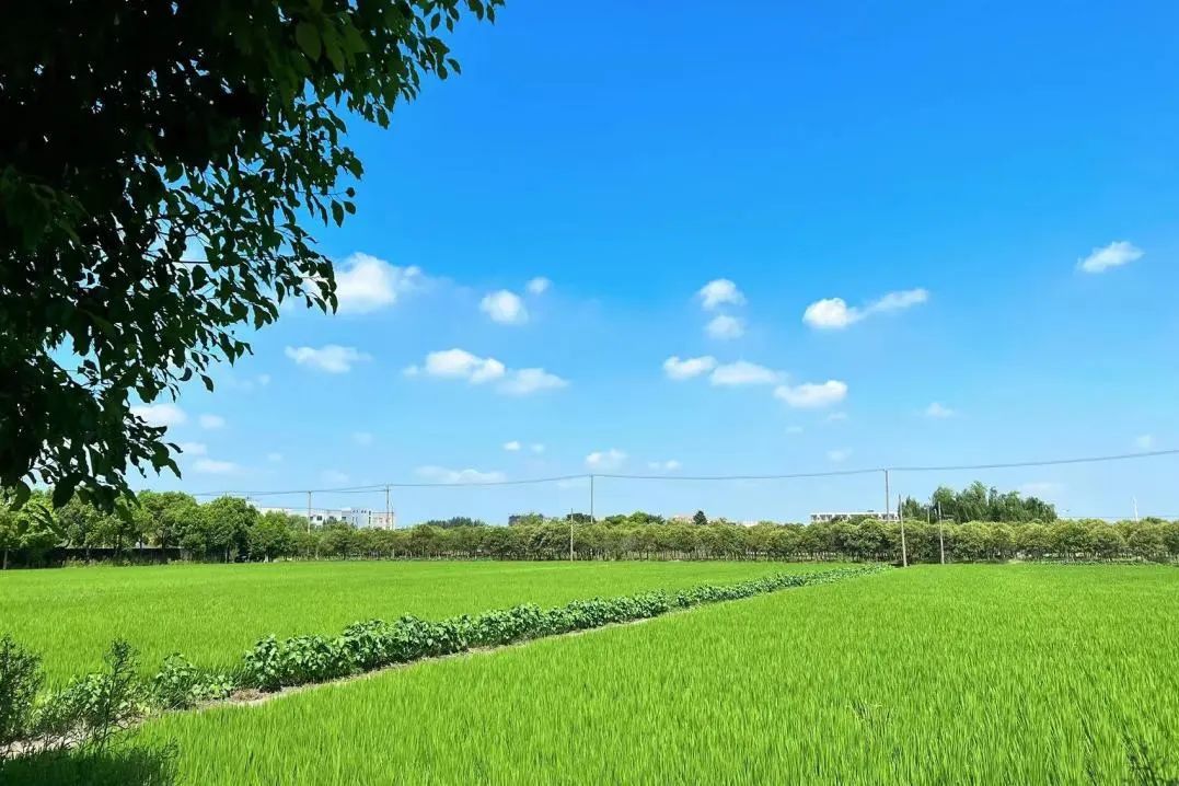 田园郁郁葱葱,绿油油的田野与纵横交错的田间小道相映成趣。