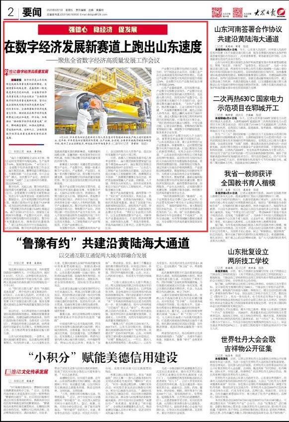 8月31日上午,全省数字经济高质量发展工作会议在济南召开。9月1日出版的大众日报,围绕如何在数字经济发展新赛道加速前进,介绍了济南、青岛西海岸新区、枣庄市薛城区常庄街道等地的典型经验,推介了海尔集团、浪潮集团、杰瑞集团、山东卓创资讯股份有限公司等企业的发展案例,具体内容,请看本期“大众日报关注”。