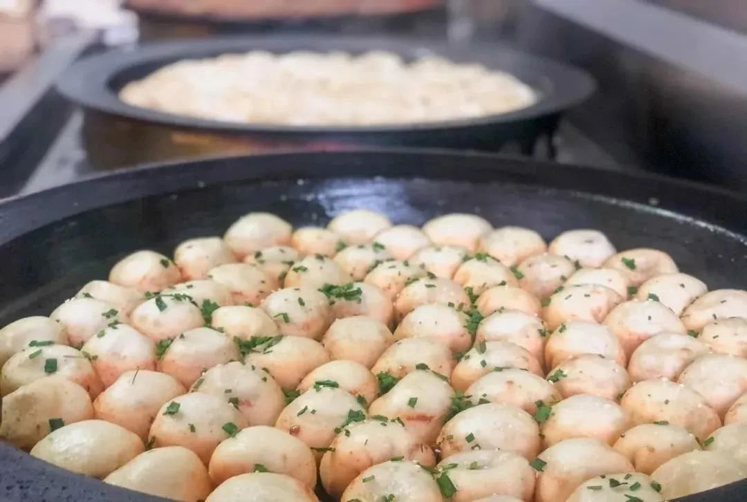 凯绿家的生煎可谓正经的生煎馒头,起盖出锅那一刻最为壮观,原先雪白玲珑的一锅面胚,变成饱满鼓胀的小馒头,在油和水中微微颤动,香气扑鼻。