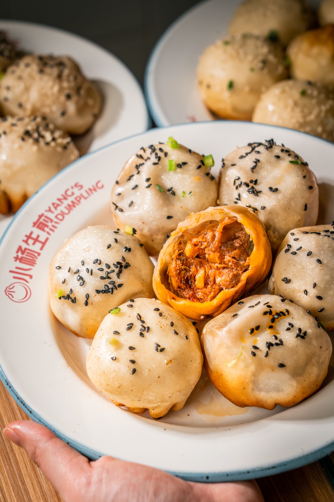 新派做法的小杨生煎面皮不发酵,即包即煎、皮薄汁多,深受年轻人的喜爱。趁着热腾腾的时候最好吃,咬破面皮,把滚烫的甜甜的汤汁吸入口腔,加入醋或者辣油,真是回味无穷。