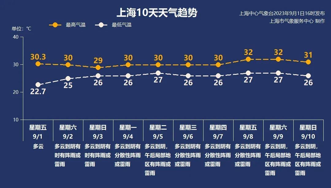 ,上海主要受到海上偏东气流的影响,云系较多,伴有分散性降水。白天最高气温将回升至30~32℃,最低气温在26~27℃,体感上会感觉有些热。