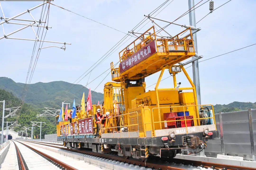 8月24日上午,在安徽省池州市青阳县蓉城镇池黄高铁池九区间木堰特大桥30锚段建设现场,随着接触网恒张力放线车缓缓启动,作业人员熟练完成起锚、放线、紧线、落锚等工序,池黄高铁首条接触网导线成功架设,标志着池黄高铁“四电”工程全面进入冲刺阶段。