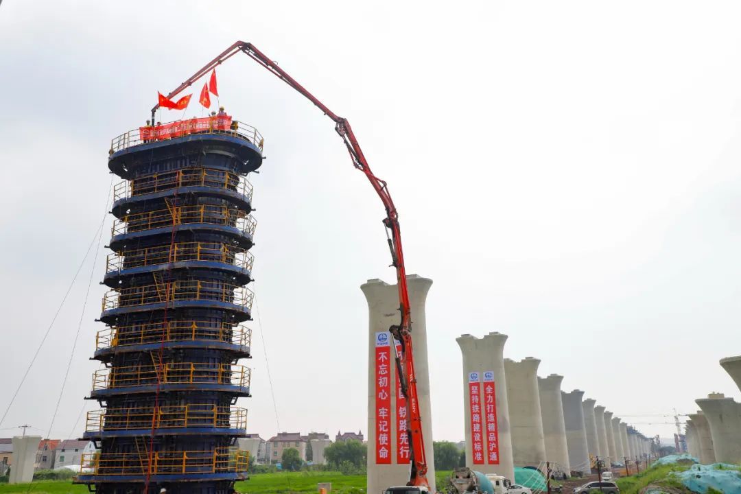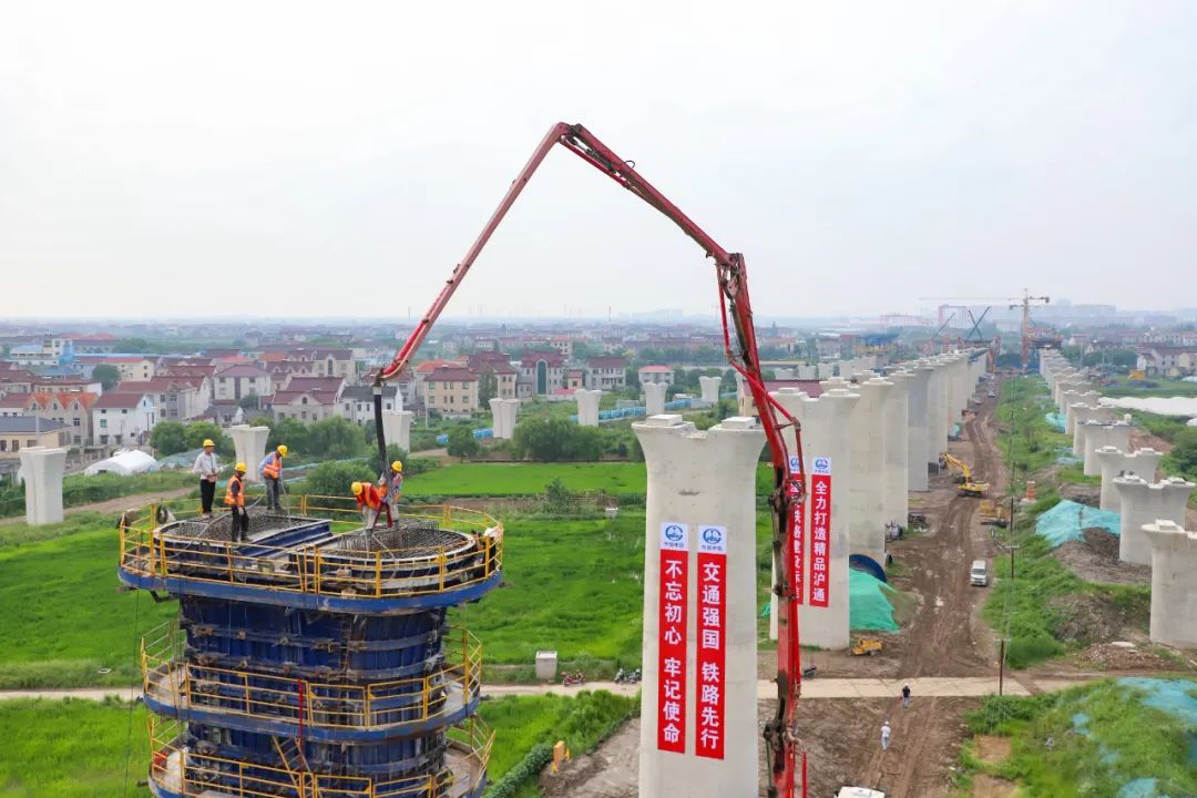 8月23日10时20分,在上海市浦东新区祝桥镇红三村动车双线特大桥施工现场,随着最后一方混凝土灌入2号墩模板内,标志着沪苏通铁路二期(太仓至四团段)动车双线特大桥32个墩身全部完成浇筑。