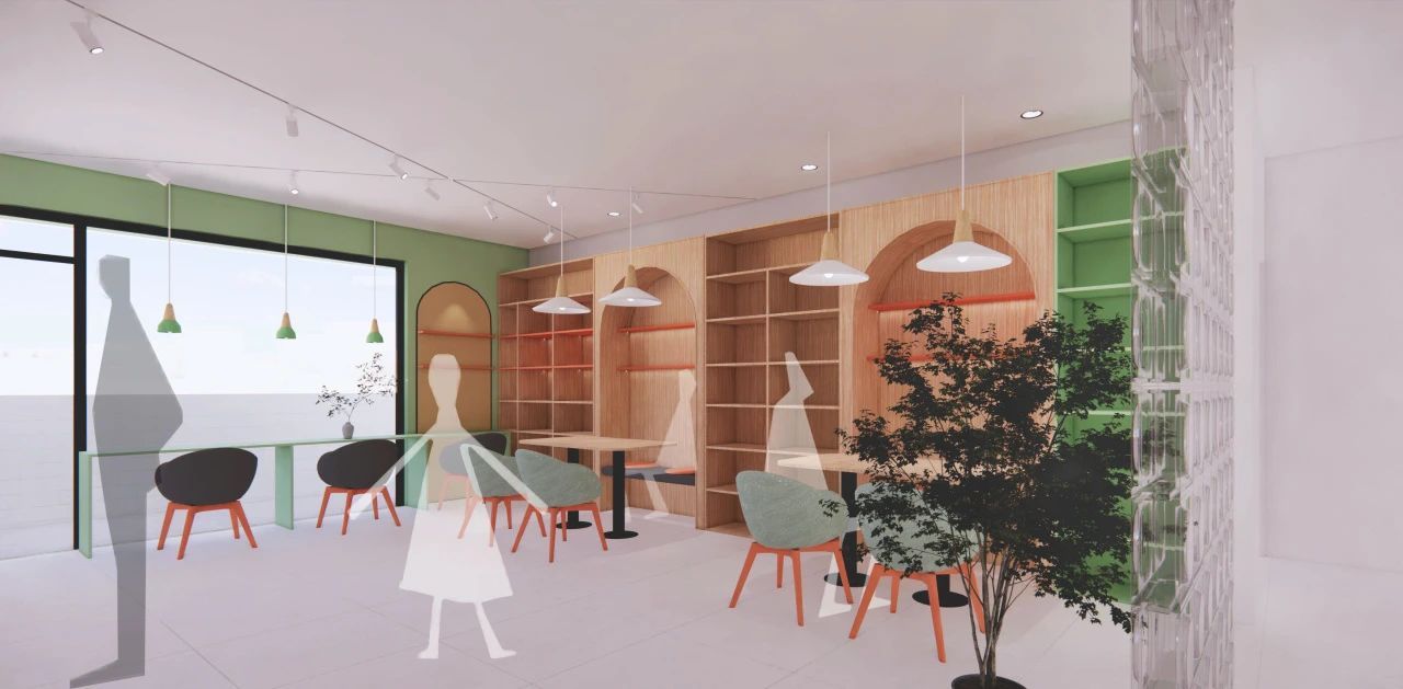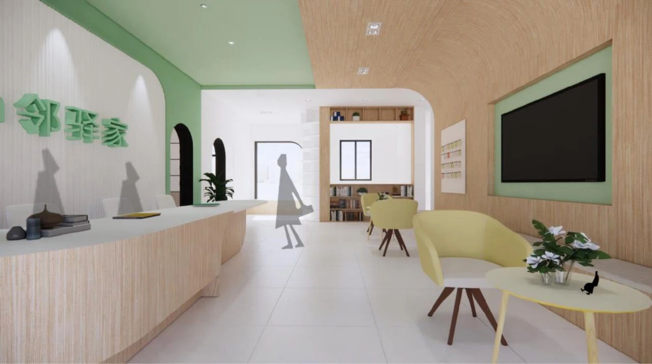 1F·元气服务站|一楼入口处的空间承担着社区共享客厅的功能,让每一个进入里面的人感受到家的温馨,汲取到元气满满的活力。
