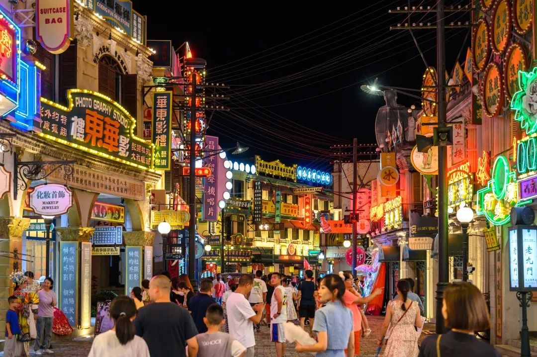 在横店影视城的广州街•香港街景区,有这样一部电影,每天晚上7点半,现场演、现场拍、现场放映,整个香港街夜景都是电影的舞台。游客换装完毕,既是观众,也是演员,边走边演,边演边拍。爱情、谍战、功夫……真实的电影世界都在大型行进式演艺秀《走进电影》中逐一展现。闪烁的霓虹灯勾勒出广州街·香港街浪漫复古的轮廓,整个景区都成了大型沉浸式的影视夜片场,流金岁月,流光溢彩。