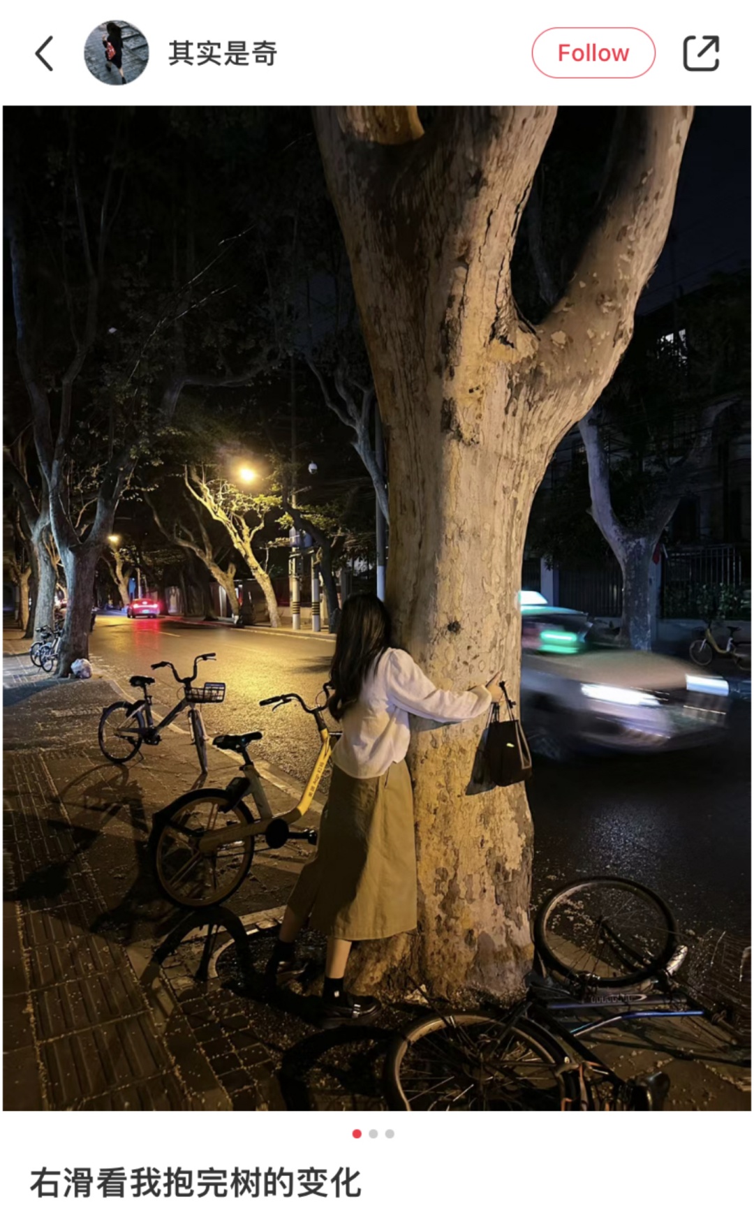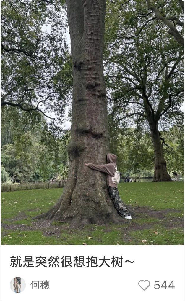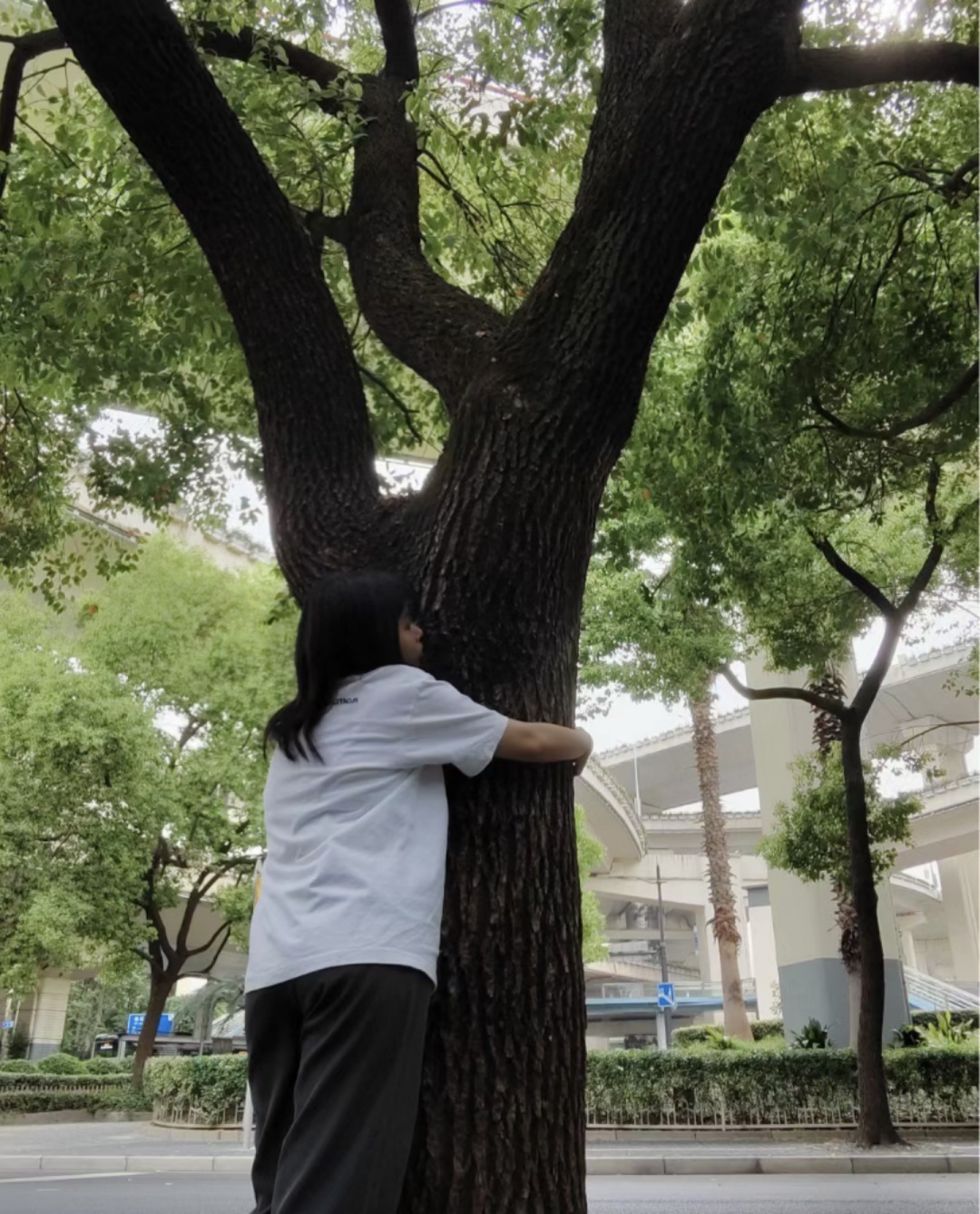 拥抱大树,假装拥抱迟到的朋友。(图/@一滋阳)像一滋阳这样的抱树爱好者不止一个。今年4月,上海街头出现了一个酒后抱树的奇怪身影。“当时和先生喝完酒走在长乐路上,差不多是凌晨1点,街上没有人。刚好走在梧桐区,望着身边一排梧桐树,夹杂着酒意,突然想起之前听说过的‘抱树’,我跟先生说,自己也想去尝试一下。”在酒精冲击下微微发热的脸贴上树皮,奇奇觉得这树冰冰凉凉的,有种很舒服、很治愈的感觉。3年前,奇奇还是一个会被虫子和泥土劝退的人,而现在的她对绿植格外迷恋,即使看到树上有虫子,也不再感到抗拒。自从发布了4月份的第一篇抱树帖,奇奇就经常收到咨询“抱树疗法”的私信。“我对‘抱树疗法’这个词有点抵触。我认为它不是一个可以实质性解决问题,甚至说治病的疗法,它只是抱起来很舒服而已。”抱树带给奇奇最大的感悟——她发现大树是能够承载所有倾述的最佳载体。与人拥抱,她会时常担忧对方是否能支撑住自己倾吐的焦虑和负能量,但与大树拥抱,它会沉默且耐心地听你说完内心话。前电商营销绿子介绍,“我第一次抱的是古树,在北京颐和园,一棵成长于清朝时期的松柏。第二次抱树是在杭州九溪,我和朋友们共同合抱了一棵很大的水杉。第三次是在新疆塔克拉玛干沙漠,我抱了一棵生命力特别顽强的胡杨。“我觉得抱树和禅修很像,本质上都是一种觉知的过程。对于我而言,抱树让我回到了野人的状态,很自由,很宽阔,然后不知不觉勇气好像也会增加。抱树正在变成我的习惯,旅游途中或者周末我都会去抱一抱,就好像汽车行驶在公路上,需要不断加油一样”,绿子总结。虽然当今科学界确实给出了“抱树”等自然疗法对人们身心健康有着一定正向改善作用的报告,但更多的只是作为一种辅助手段而已。大家可以去尝试,但请不要将其当做一种解决心身问题的唯一方式。如果你发现自己有着严重的心理和生理上的问题,还请及时向专业人士寻求帮助。作为一名植物研究者,马丁·萧也表现出对“抱树”潮流的担忧:一棵树就是一个直立的生态空间,虽然看不到,但树干上有很多微生物,去抱它会破坏这些珍贵的生态环境。因此,他建议,亲近自然也需保持必要的距离。“如果非要抱,就选择比较普通的树种,那种身上没有附生动植物的,比如樟树。”还有,在“抱树”前一定要先观察树木的健康、卫生和安全情况。市区常见的槐树、柳树、杨树、松树、榆树、法桐等,夏天正是分泌树胶的旺盛期,抱它们太容易蹭脏衣服了。如果是雷雨天气,抱树显然也不是一个安全的选择。