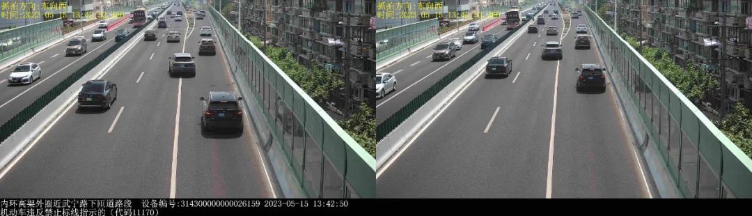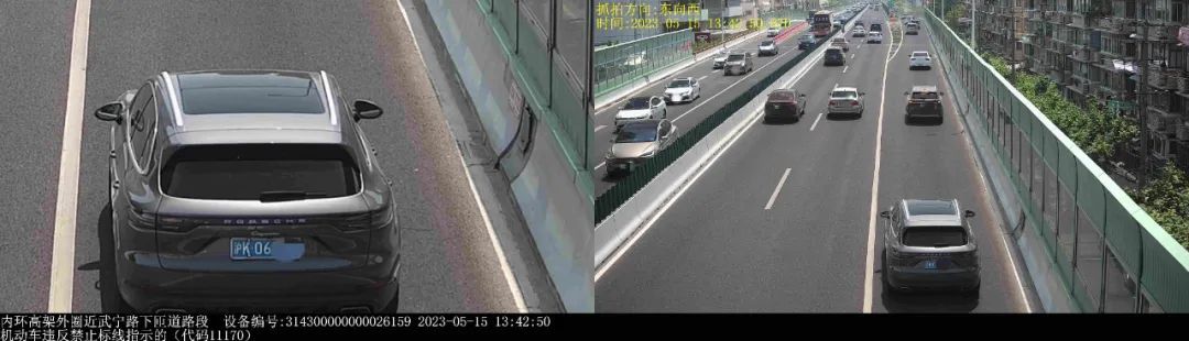 ▲2023年5月15日13时42分,号牌为沪K06***的小型越野客车在内环高架外圈近武宁路下匝道路段,实施了“机动车违反禁止标线指示的”违法行为。