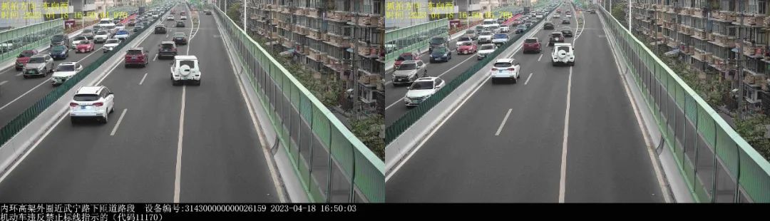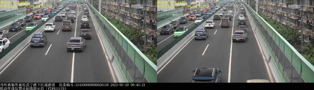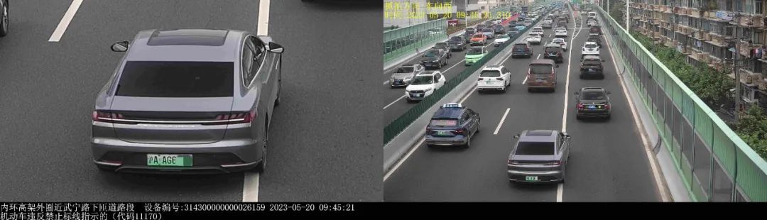 ▲2023年5月20日9时45分,号牌为沪AAG6***的小型轿车在内环高架外圈近武宁路下匝道路段,实施了“机动车违反禁止标线指示的”违法行为。