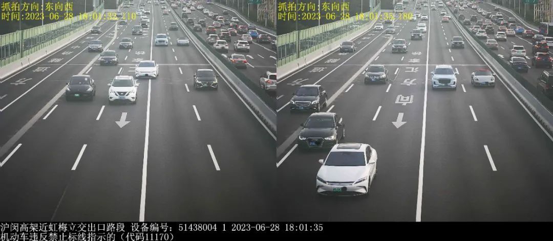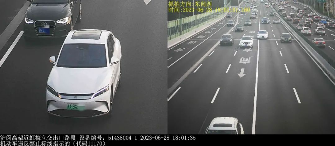 ▲2023年6月28日18时1分,号牌为沪ABK2***的小型轿车在沪闵高架近虹梅立交出口路段,实施了“机动车违反禁止标线指示的”违法行为。