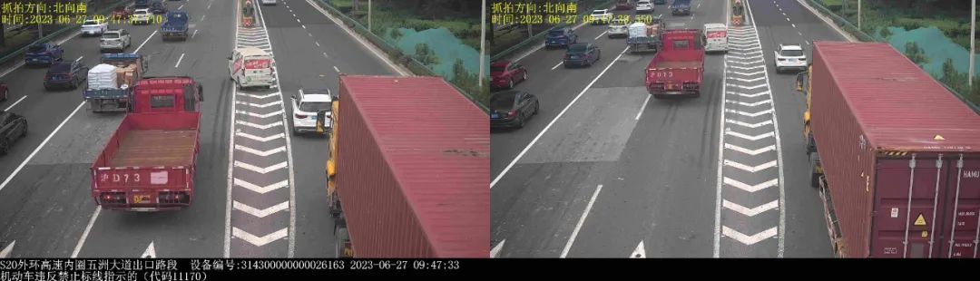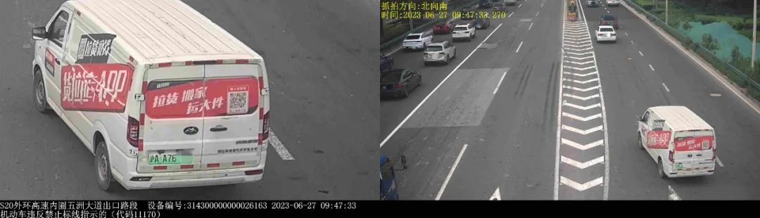 ▲2023年6月27日9时47分,号牌为沪AA76***的轻型封闭式货车在S20外环高速内圈五洲大道出口路段,实施了“机动车违反禁止标线指示的”违法行为。
