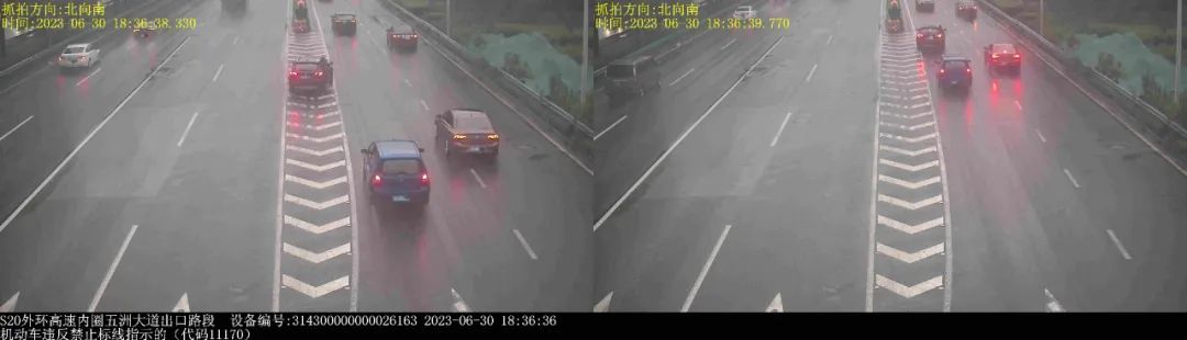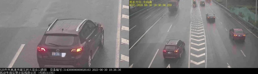 ▲2023年6月30日18时36分,号牌为赣B36***的小型普通客车在S20外环高速内圈五洲大道出口路段,实施了“机动车违反禁止标线指示的”违法行为。转录编辑:林心怡