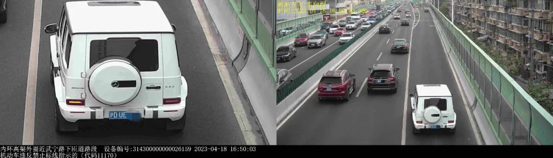 ▲2023年4月18日16时50分,号牌为沪DUE***的小型越野客车在内环高架外圈近武宁路下匝道路段,实施了“机动车违反禁止标线指示的”违法行为。处罚:罚款200元,记1分
