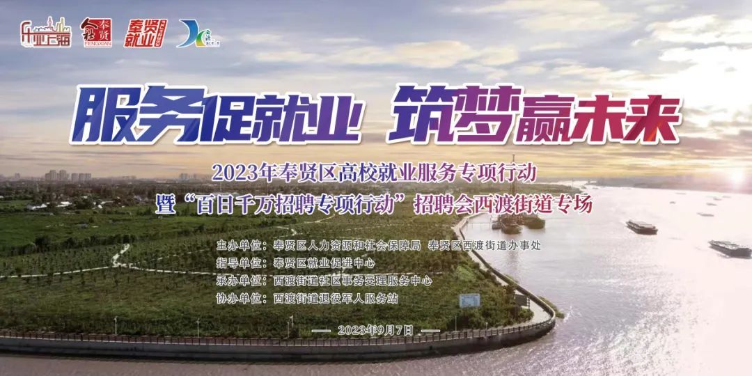 为满足广大求职者的就业意愿和企业的用工需求,切实促进西渡街道辖区内的就业和创业工作,西渡街道将于2023年9月7日上午举办服务促就业 筑梦赢未来——2023年奉贤区高校就业服务专项行动暨“百日千万招聘专项行动”招聘会西渡街道专场,为求职者和企业搭建一个交流平台,实现面对面双向对接。