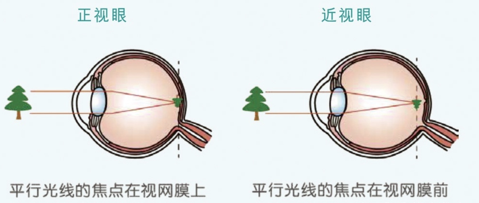 王虹霞指出,近视是一种常见的视觉障碍,在儿童和青少年中尤为普遍。当眼在调节放松时,平行光线通过眼的屈光系统(角膜、房水、晶状体和玻璃体)后聚焦在视网膜之前,这导致远处的物体不能在视网膜上形成清晰的图像,这种现象就叫做近视。