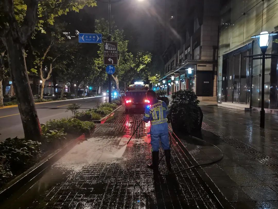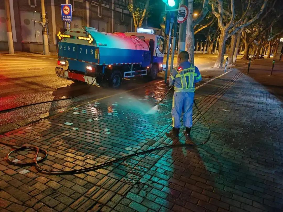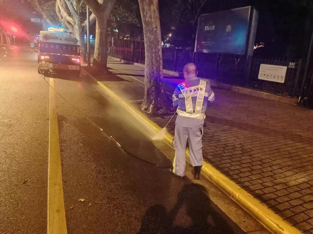 深夜,繁华、喧闹的黄浦已逐渐安静下来,而此时的道路上,多了几处红蓝灯在闪烁,远远看去特别显眼。原来,这是负责清扫道路的环卫工人们正在忙碌,为接下来即将开始的夜间深度保洁做好准备工作。
