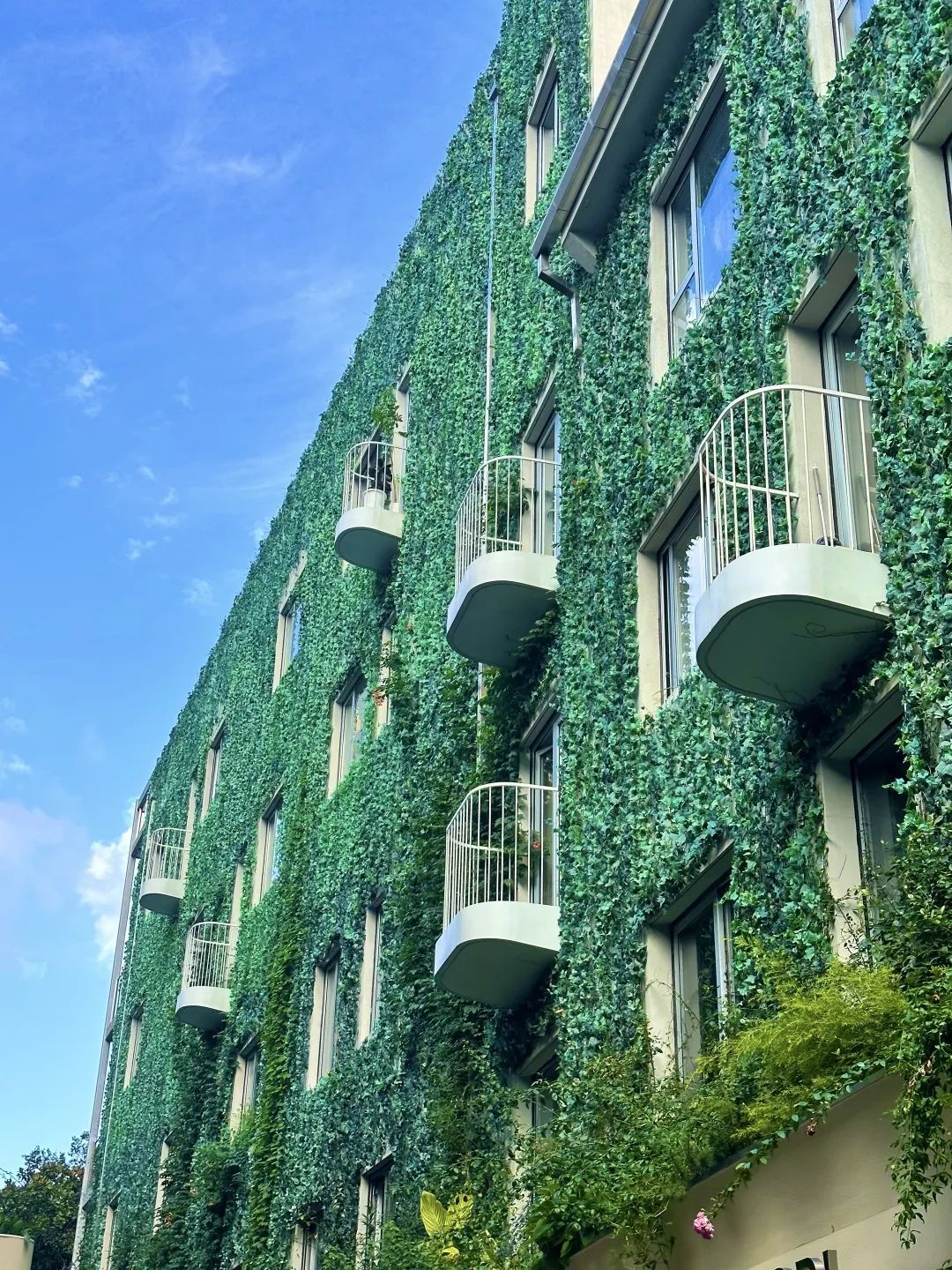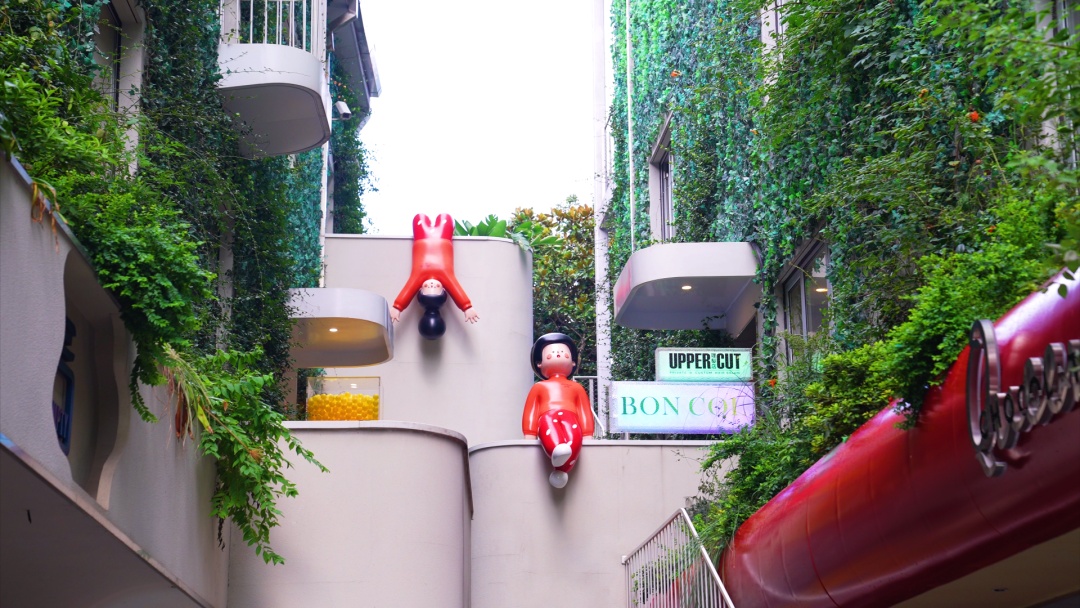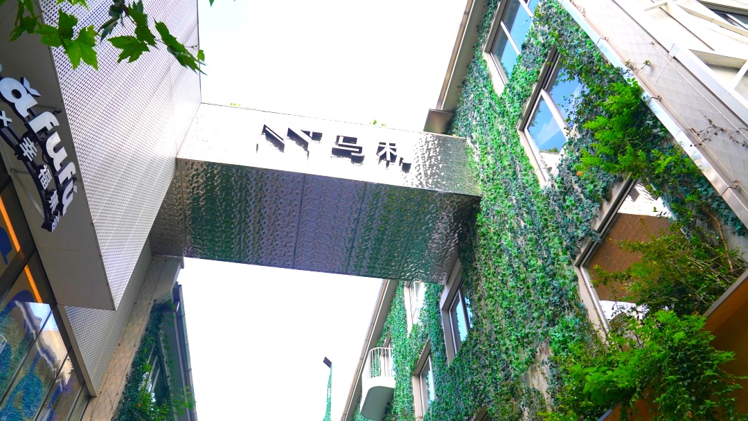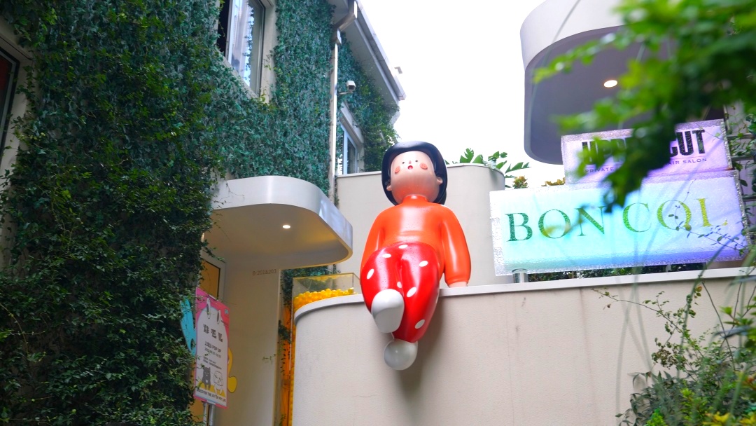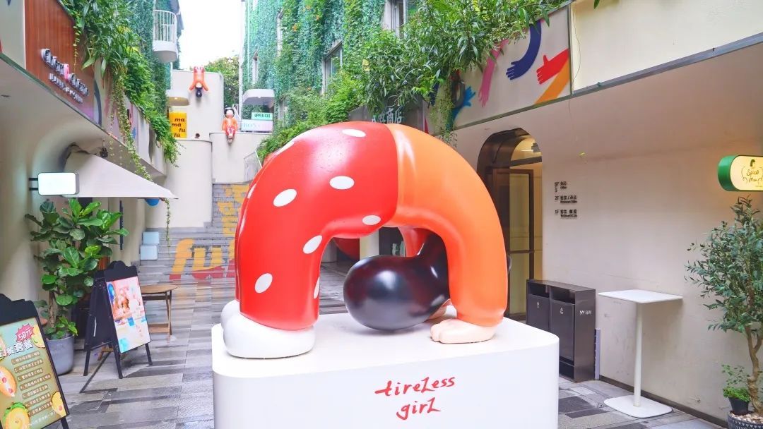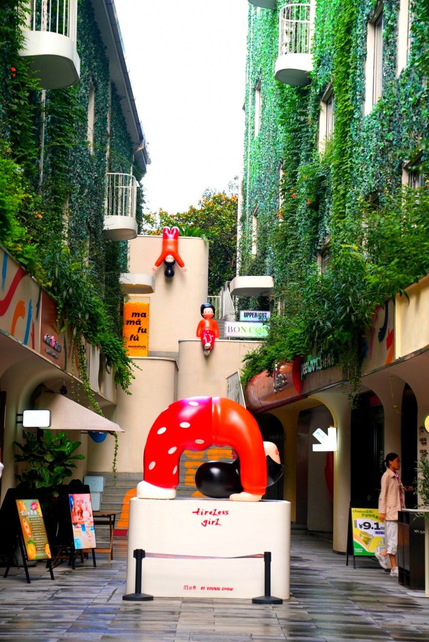 油绿的爬山虎在建筑外墙延伸,点缀其间的白色阳台,连接街区的彩色楼梯,“下腰女孩”雕塑,唤醒城市的生机和记忆。