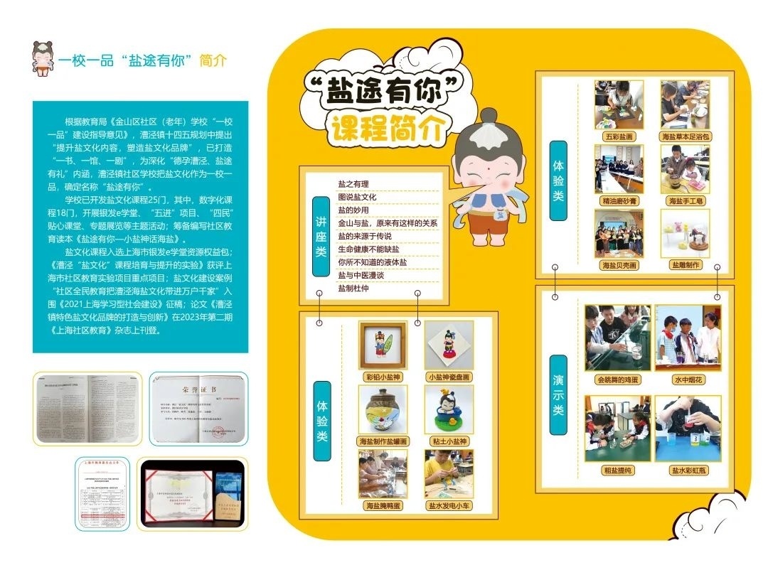 漕泾镇社区学校自2020年创建《盐途有你》终身学习品牌项目以来,深入开展研发,将盐文化元素与各类课程融合,目前已开发盐文化课程25门,其中数字化课程18门。该项目年均开展72场盐文化体验活动,为市、区、镇三级各年龄段的居民提供学习服务,累计已有35694人次参与,深受社区居民喜爱。